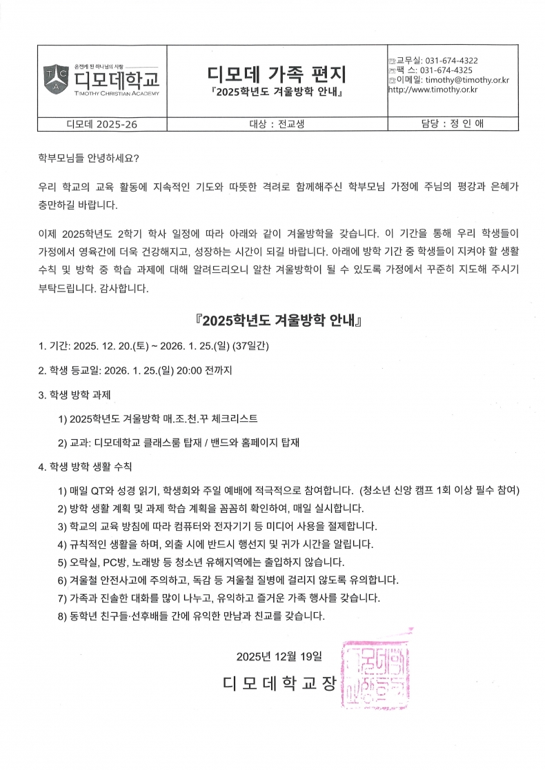 TCA이야기 > 가정통신문 가정통신문 TIMOTHY CHRISTIAN ACADEMY