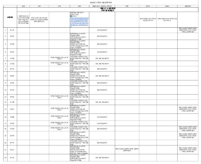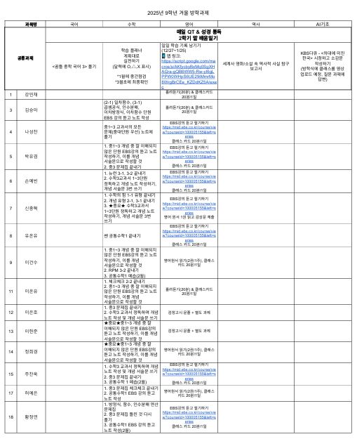 2025학년도 겨울방학 과제 링크 https://docs.google.com/spreadsheets/d/16XFCf80iFjXqzXg_KZQ30PUz0UPez11oUwLyEREEKOA/edit?gid=2002297536#gid=2002297536 ![]() |
